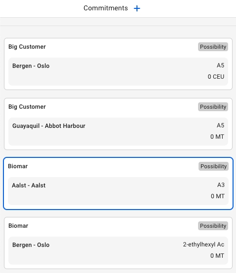 The left-most column, Commitments, contains all the unallocated cargos. Each cargo contains the fields: