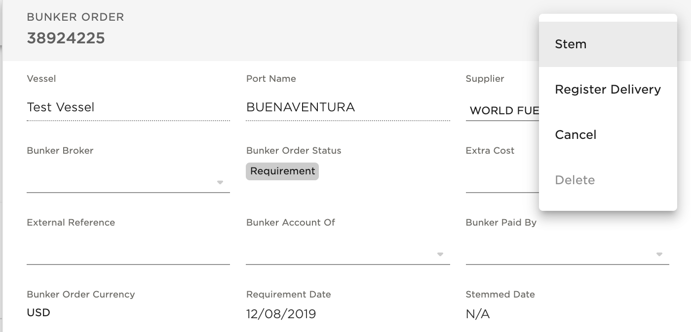 When a bunker order requirement is stemmed you should update the system with the agreed supplier, prices and quantities and status.