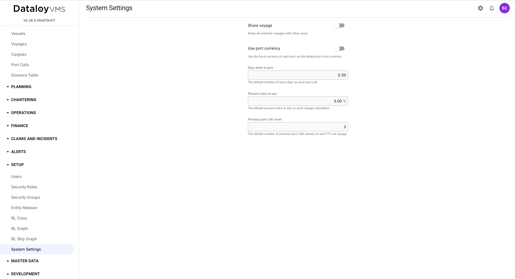 The settings on this page enables administrators to customise default behaviours in VMS, e.g. Days extra in port controls the number of extra days automatically added to new port calls. Note that system settings is applied globally to the environment, which means any change alters the functionality for all users.