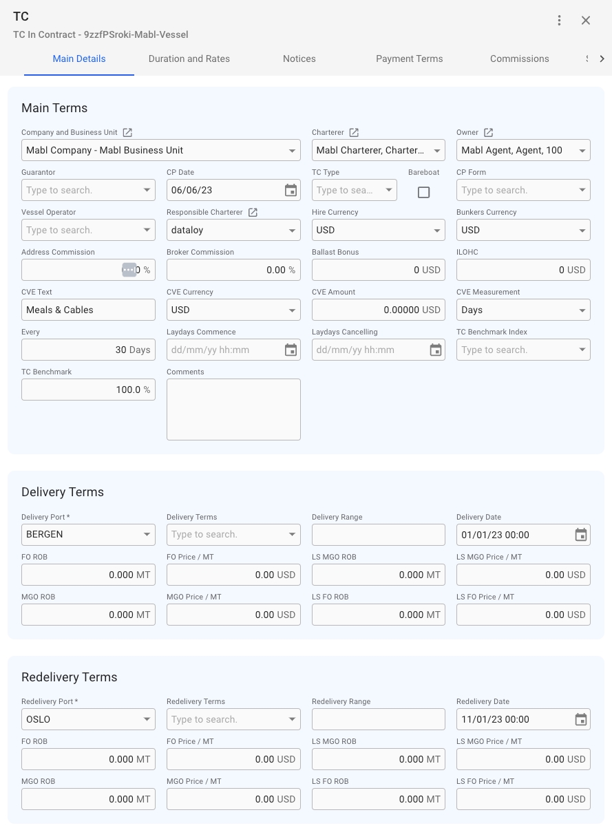 The Main Details tab that is shown by default when opening a Time Charter Contract has 3 sections where you can edit information on the Time Charter Contract.