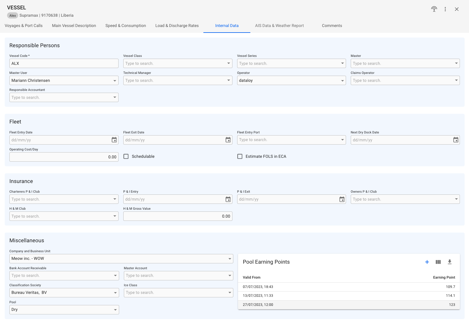 Here, you can set fields like Company and Business Unit, Bank Account Receivable, Master Account, Classification Society, specify the Ice Class (if classification society is selected), and Pool, as well as the Pool Earning Points. In this table, you can create, edit, and delete a Pool Earning Point: