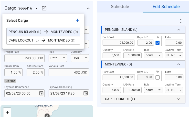 Selected Cargo: the currently selected cargo can be chosen inside the select cargo modal, which can be invoked by clicking the expand cargo button (triangle facing down inside the left section, see figure 3). The selected cargo will be the subject of the Edit Schedule list. The Port Calls contained in the list correspond to the selected cargo, and the related values change dynamically if another cargo is chosen.