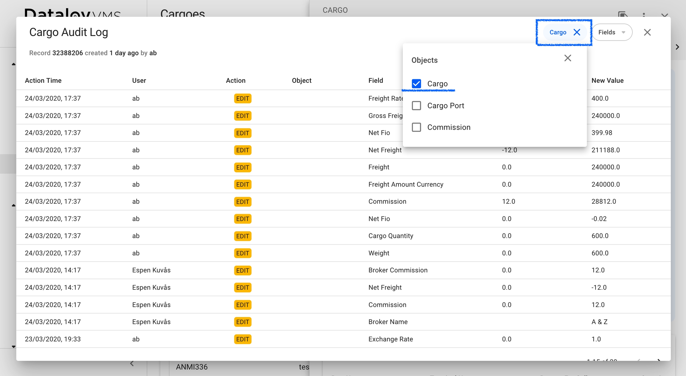 Once in the Audit Log modal you will see the changes of the item that was opened in the drawer sorted by date with latest changes on top.