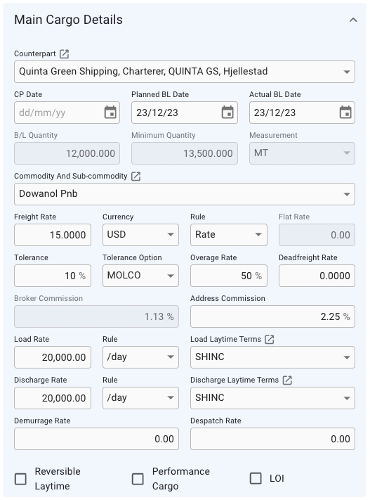 On the right side, below the Bunker Adjustment section, you can enter external reference, Trade, Cargo Text, Comment, Company, Business Unit and Cargo Operator: