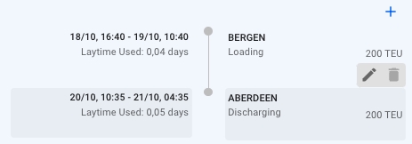 To add a cargo port, click on the -icon in the top right corner. To edit a cargo port or delete a cargo port hover one of the cargo ports in the timeline and the below view will appear: