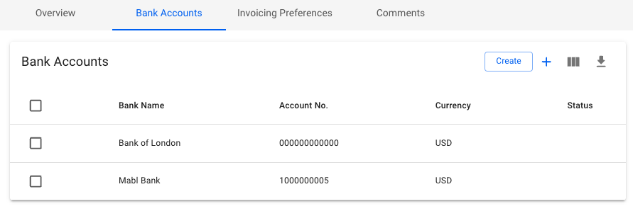 The tab contains a list of all the Bank Accounts belonging to the company. The usual list operations are available, with two minor changes: