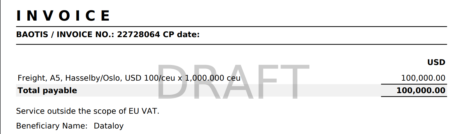 If you don't have the EU Tax Automation property set up (see the warning below), your invoice does not have any document line for the account Freight, or your issuing company is not in the EU (aka you don't meet any of the previous criteria), then the printout will look like before: