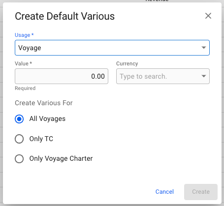 Fill in the values: - Usage: The object that will trigger the creation of the various - Value: The value of the various when created - Currency: The currency of the various value (optional) In addition, when creating a default various with the usage object "Voyage", it is possible to select whether the various should be created for all voyages, only TC voyages, or only voyage charters.