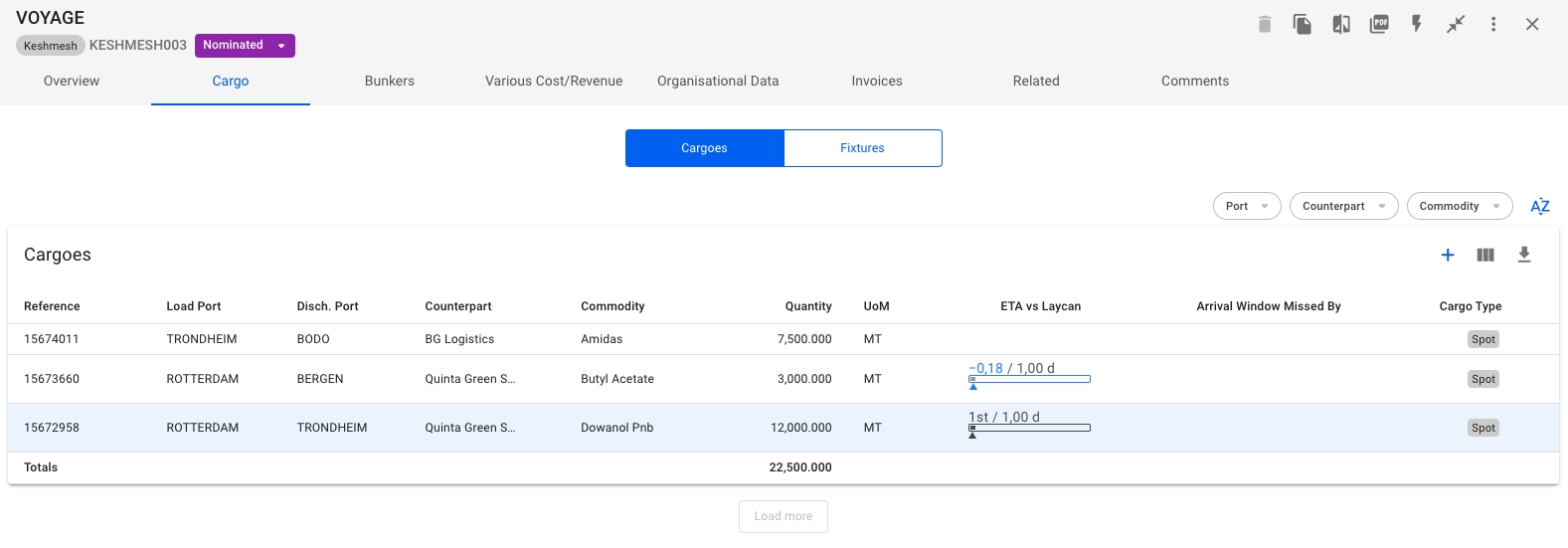 This tab shows a list of the cargoes and fixtures on the voyage.