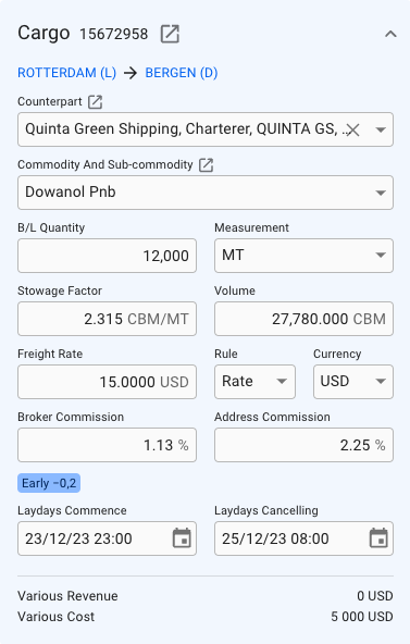 The cargo section allows you to directly change some of the fields of the selected cargo (performance cargo by default) from the Voyage drawer without having to open the Cargo drawer. If you are looking for more fields however, you will need to open the up Cargo drawer (clicking the icon will open the drawer):