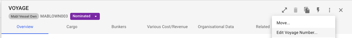 When voyage status is Nominated, Operational, Operationally Closed, Invoiced or Closed, it is possible to change the Voyage Number.