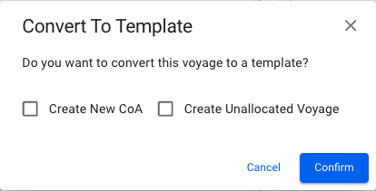 After selecting the action you will get a confirmation popup modal which allows you to select to 'Create New CoA' and 'Create Unallocated Voyage' when converting to template. When clicking the 'Confirm' button, you will be brought to the template voyage's drawer.&#x20;