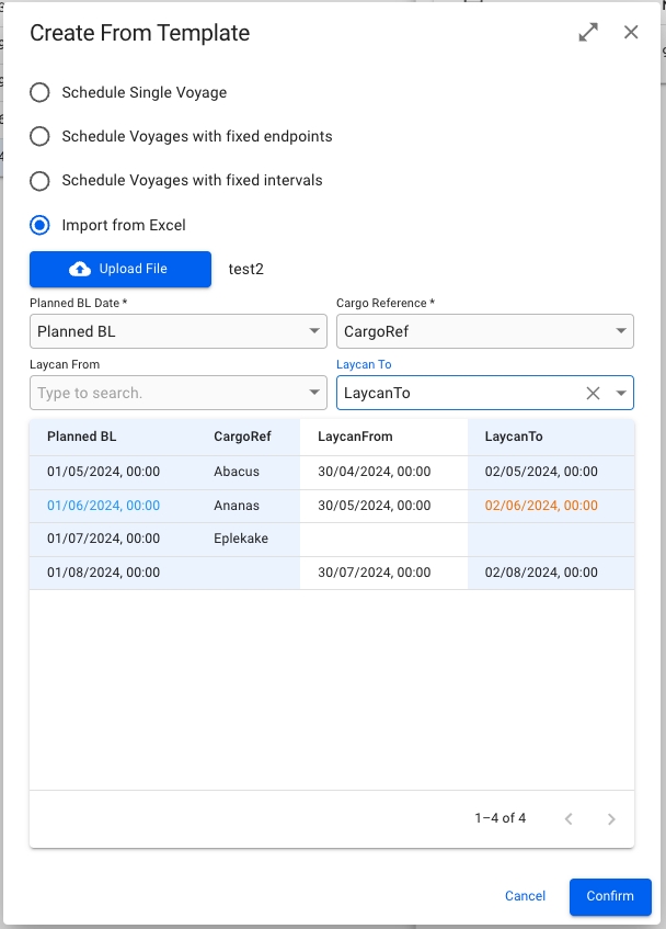 If using the "Import from Excel" option, the voyages are created in a slightly different manner. After uploading an .xlsx or .csv file, you choose which column to use for the planned B/L date and cargo reference. The laycan fields are optional, but if one is selected, both must be. The system will then create a number of voyages equal to the number of rows in the file, and set the planned B/L date and cargo reference on the performance cargo of the voyage. If laycan fields have been selected, those will also be set. Note however, that unlike the two other options for creating multiple voyages, the voyage start date is not set.