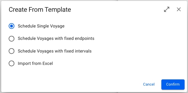 Template voyages have an additonal "Scheduled Voyages" tab. Voyages that are created from the selected template voyage are listed in this Scheduled Voyages tab. To create a new scheduled voyage click Add in the top right corner of the list. This will bring up a modal allowing you to choose between creating a single scheduled voyage, or multiple based on user input or import.