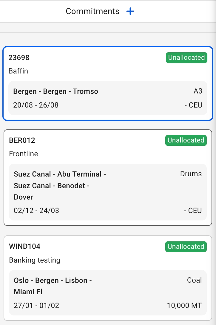 The board has two main areas- unallocated voyages (Commitments) on the left, and allocated voyages on the right.