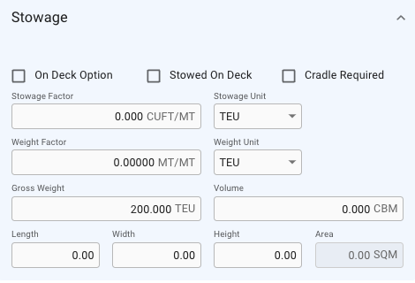 On the left side of the tab below the Main Cargo Details is the Stowage section