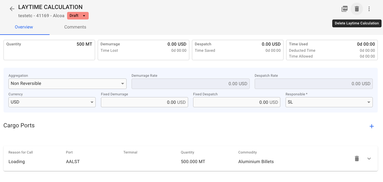 Laytime Calculation deletion button