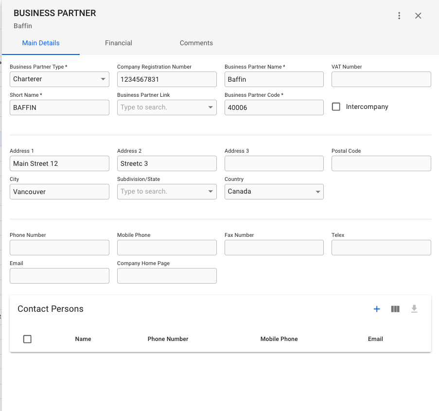 From the main details tab, you can see all the important details of a business partner. This includes Business Partner Type, Company Registration Number, Business Partner Name, VAT Number, Short Name, Business Partner Link, Business Partner Code, and indicate whether it is an Intercompany or not. You can also change the Business Partner's address, contact details and contact persons.