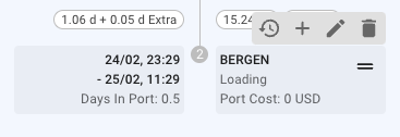 Moreover, the Port Call blocks include a small functions tooltip that provides the following actions on the voyage schedule sequence: show Port Cost history overview, create new Port Call to the current schedule, edit the selected Port Call, or delete the Port Call.