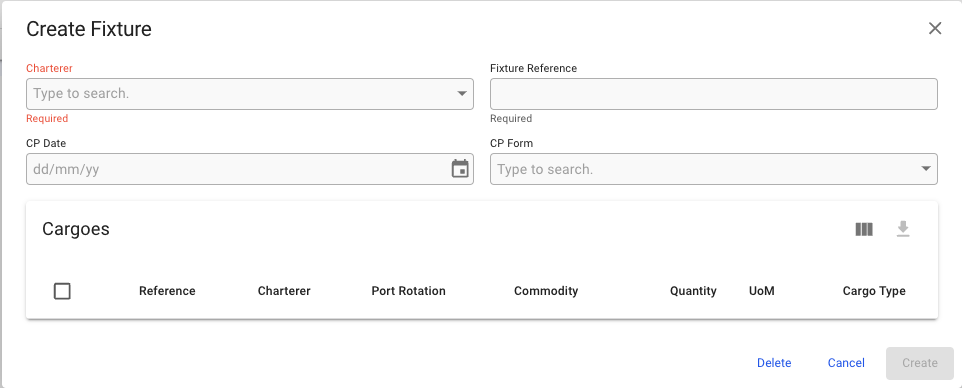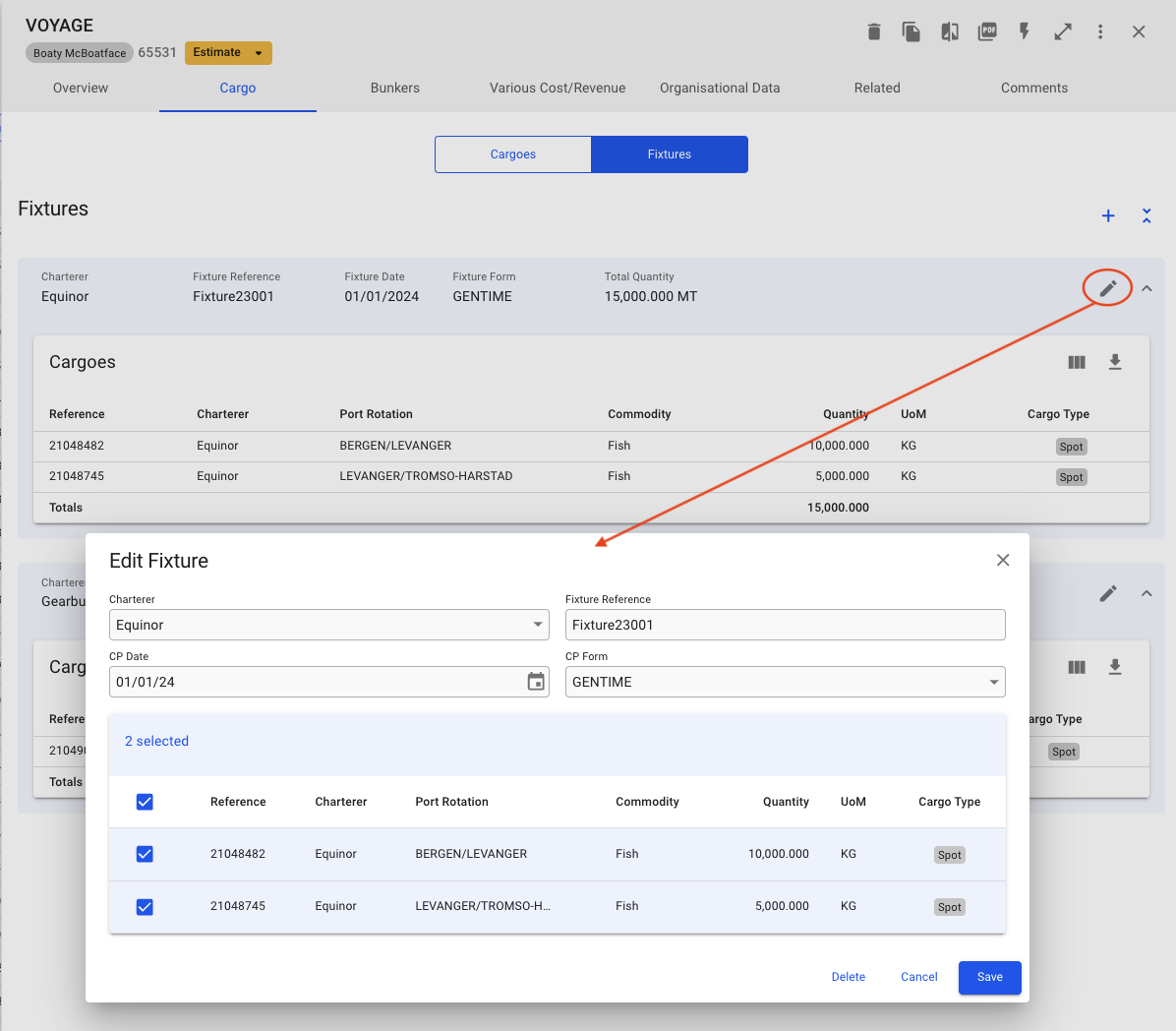 Clicking the edit-pen icon will open up the Edit Fixture modal where you can change fields and select more or de-select cargoes.