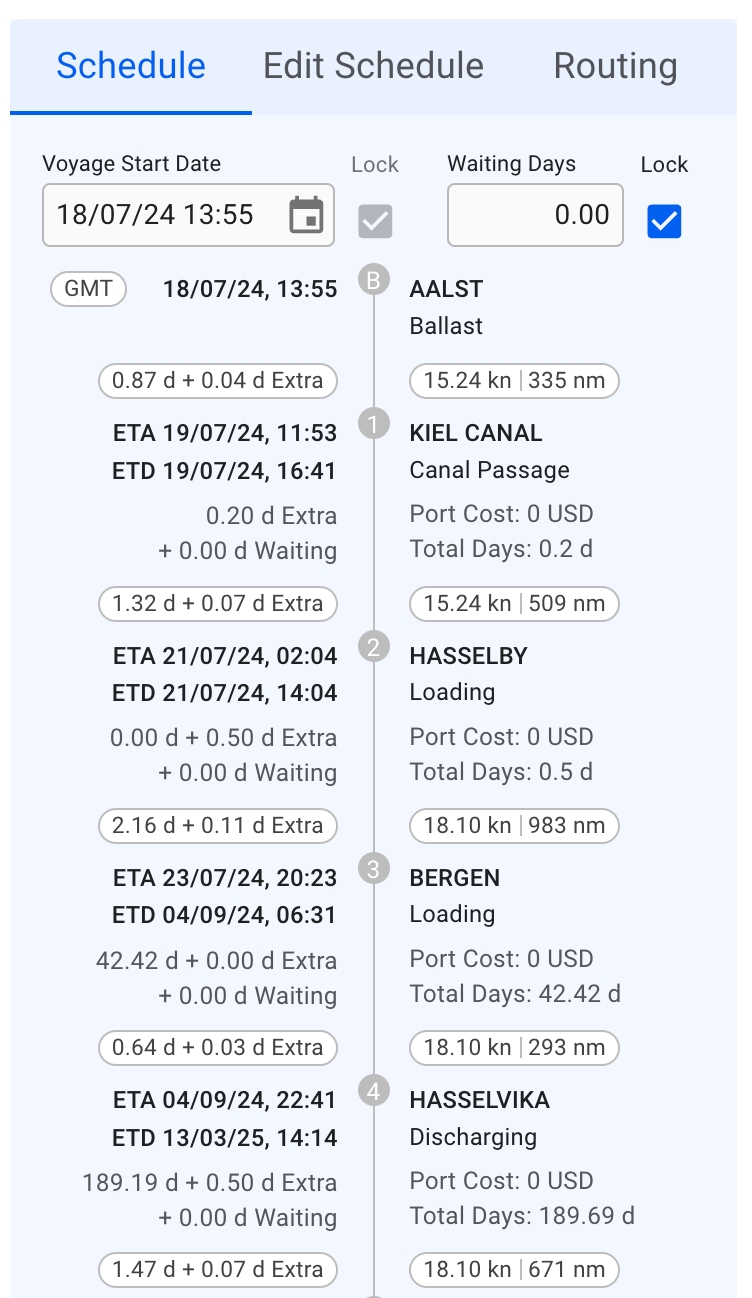 The "Schedule" section in the Voyage drawer shows three different sub-sections; Schedule, Edit Schedule and Routing.