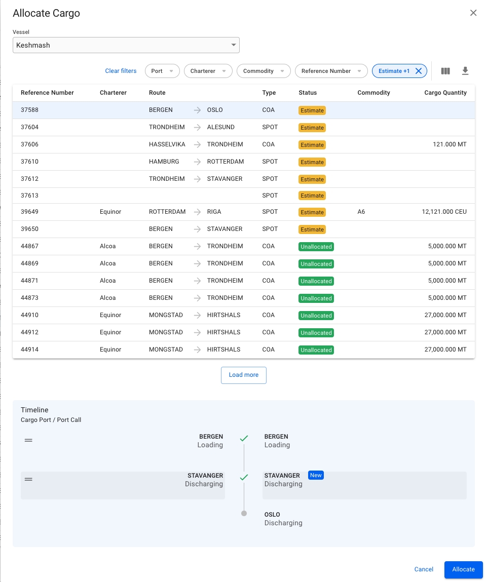 Only voyages with status Estimate, Unallocated, Allocated, Nominated and Operational. Note: It is currently not possible to allocate to budget or scenario voyages