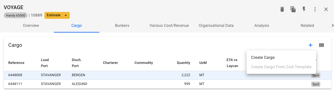 Within a TC voyage drawer, the Cargo tab is enabled for you to create new cargoes on the voyage: