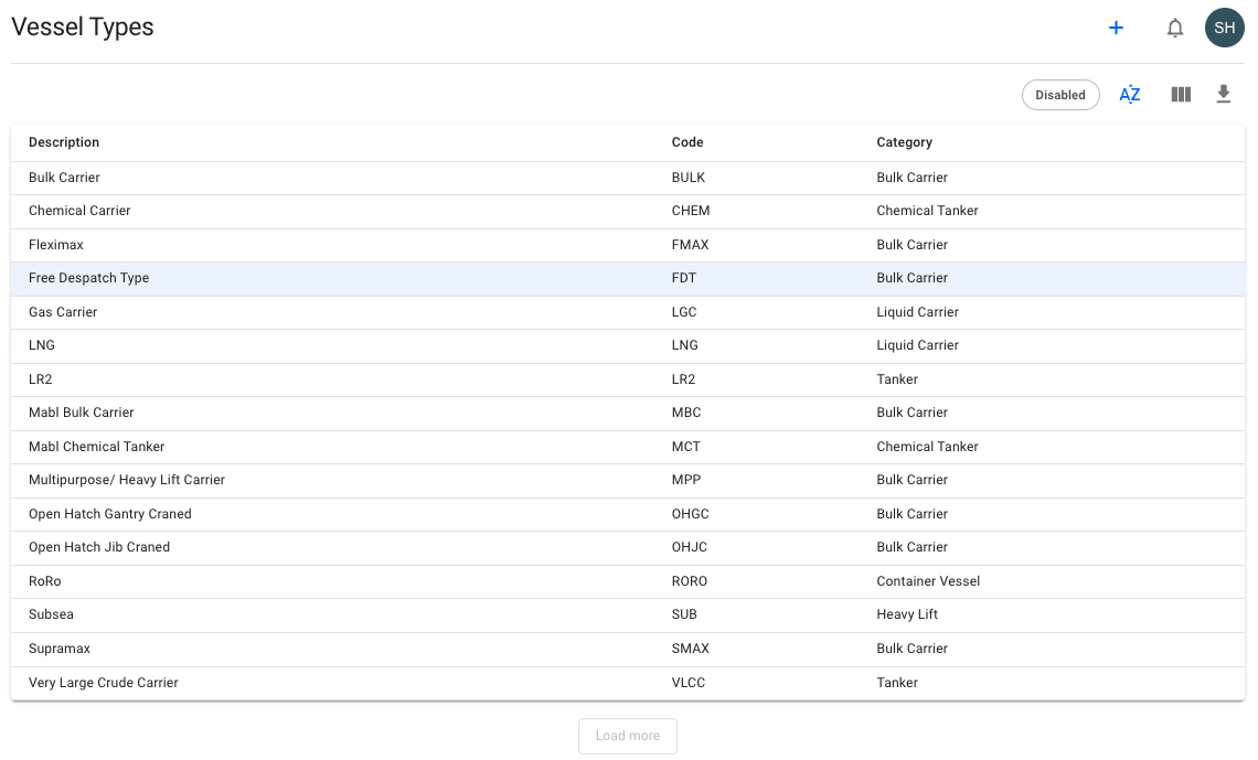 The list shows you an overview of all available Vessel Types. The usual array of list options are available, such as sorting, re-ordering, and column customisation. Clicking on a Vessel Type will open up the Vessel Type drawer.