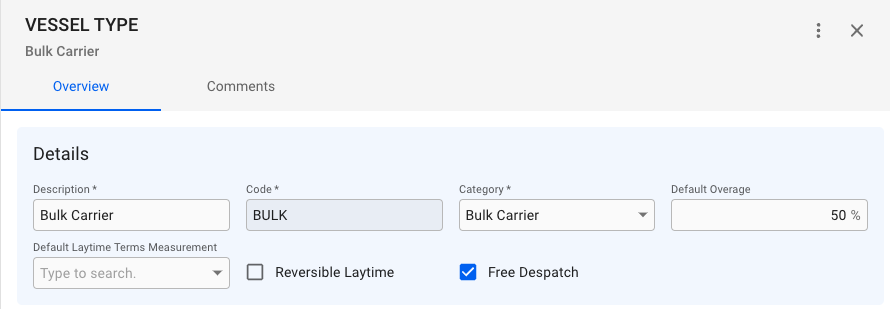 Overage on a Cargo on a Voyage will by default be set to the Vessel's Vessel Type "Default Overage"