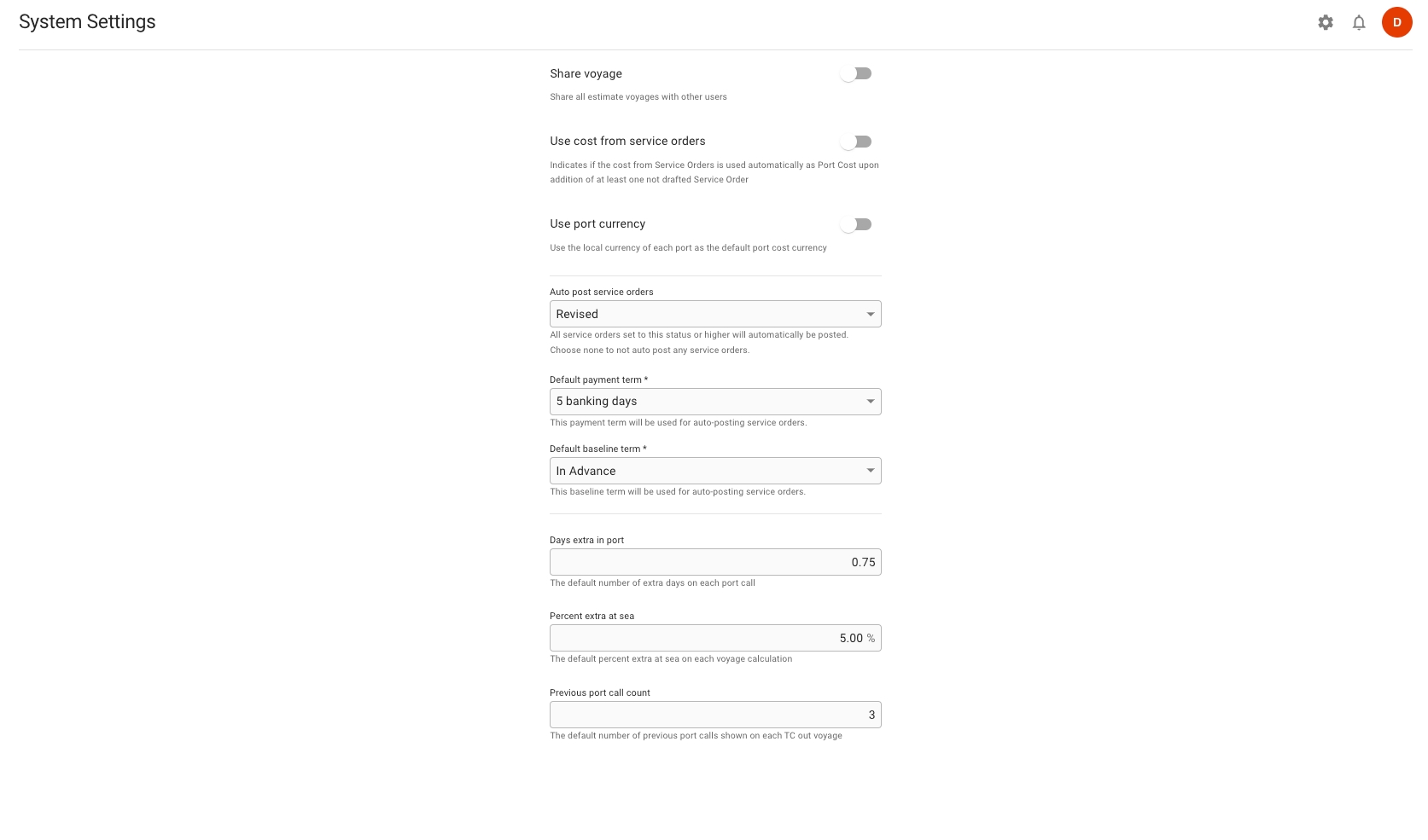 The settings on this page enable administrators to customize default behavior in VMS, e.g. Days extra in port controls the number of extra days automatically added to new port calls. Note that system settings are applied globally to the environment, which means any change alters the functionality for all users.