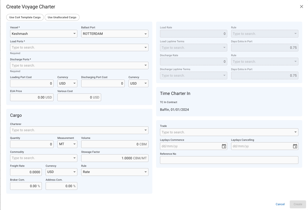 Creating a voyage charter is fast and easy. The minimum amount of details required is a vessel and a port for loading and discharging.