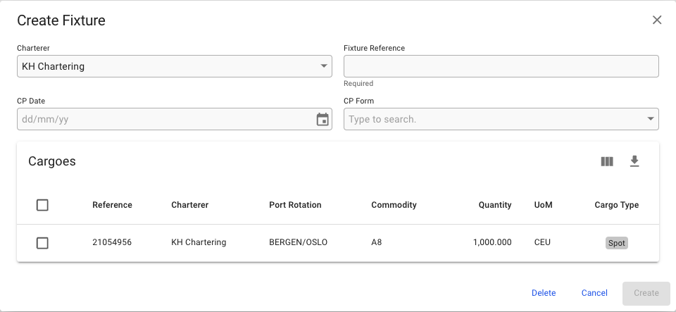 Selecting a Charterer will show all cargoes connected to the Charterer in the list below, allowing you to select the ones you want in the fixture.