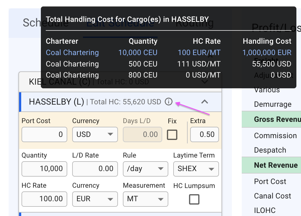 This tooltip displays, per **Port Call**, the *Charterer*, *Quantity*, *HC Rate* and *Handling Cost* for each of it's **Cargo Ports**. Again, with the *selected cargo* from the Cargo List section highlighted in **blue**.&#x20;