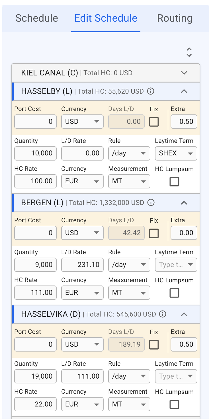The first row, in yellow highlight, you can find the **Port Call's** *Port Cost*, *Currency*, *Days L/D, Fix* checkbox and *Extra* (days in port).