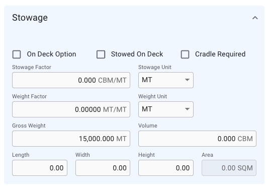On the left side of the tab below the Main Cargo Details is the Stowage section