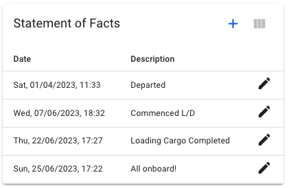 To edit or delete an event simply click on the the row that contains it, Here you can edit the date or select delete in the modal that appears and confirm - Note that this will delete it from the Statement of Facts list but **NOT** from the port log event list in the port call drawer while editing the date will effect both locations.