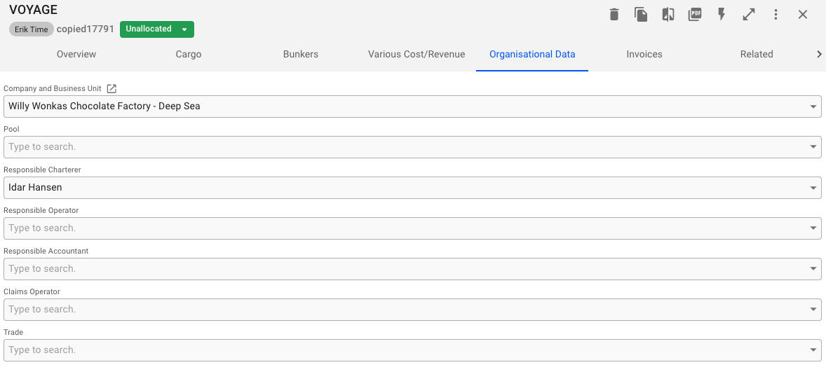 In the Organisational data tab in the voyage drawer you can edit the following information: