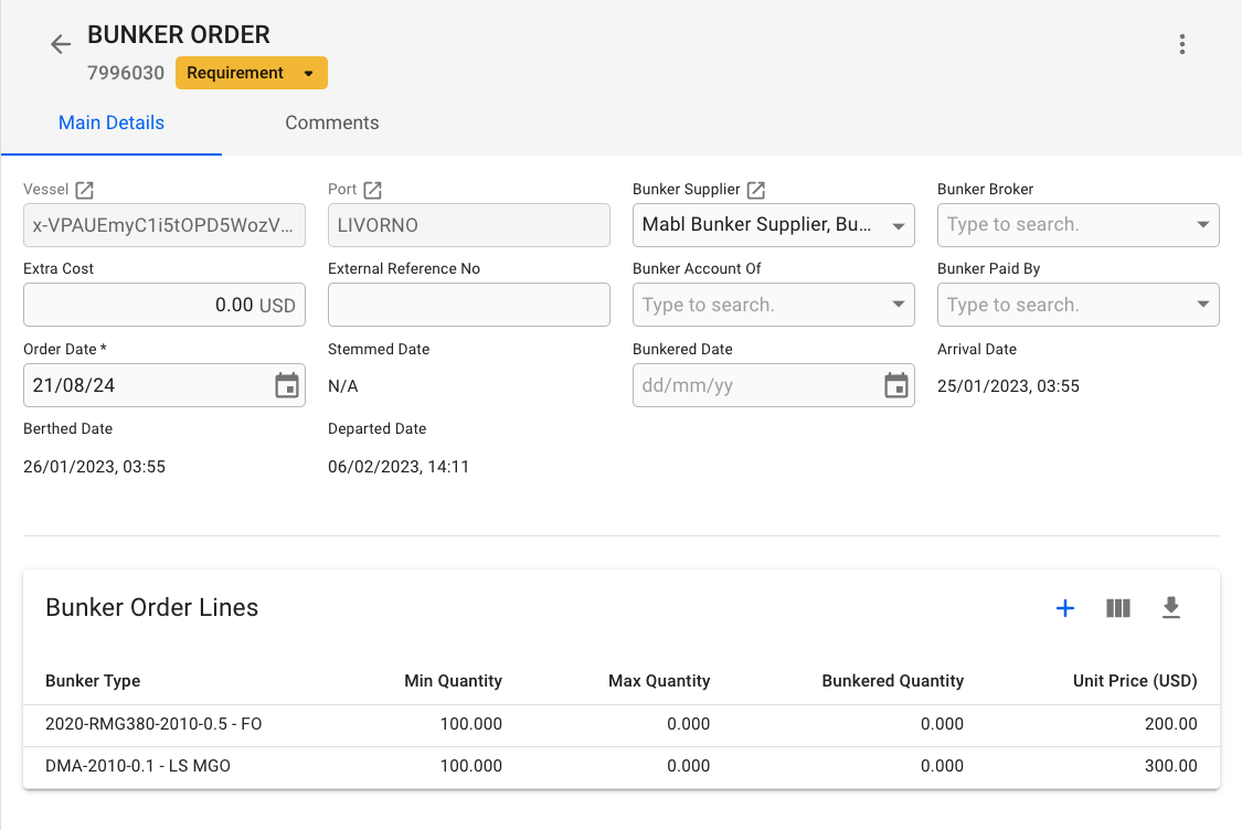 The details of a bunker order can be edited and maintained in the Bunker Order module.