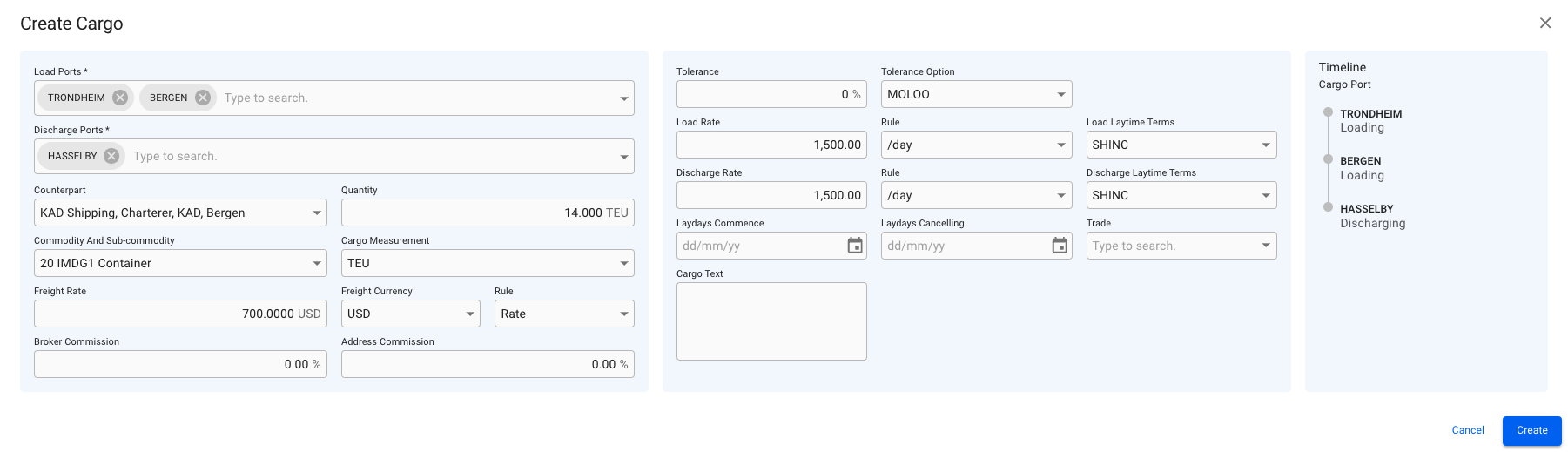 With the new multiple value component in the Create Cargo modal, you are now able to add multiple Load- and Discharge- cargo ports to the new cargo.