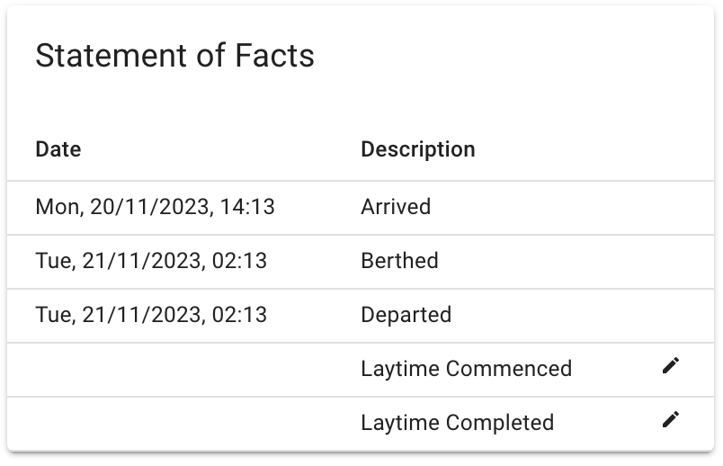 To edit or delete an event simply click on the the row that contains it, Here you can edit the date or select delete in the modal that appears and confirm - Note that this will delete it from the Statement of Facts list but NOT from the port log event list in the port call drawer while editing the date will effect both locations.