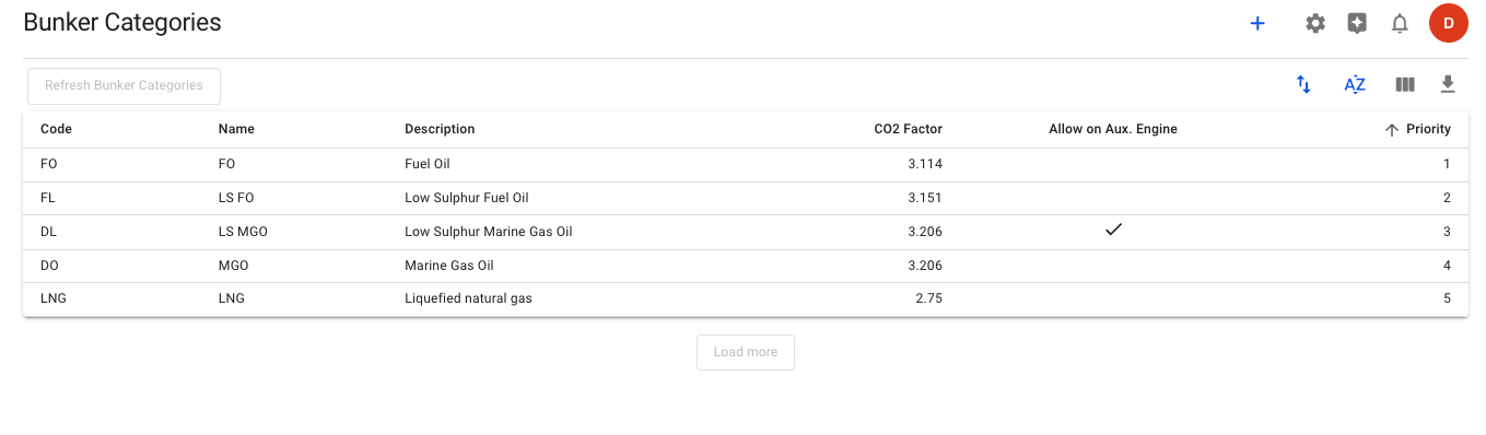 <figure><img src="https://content.gitbook.com/content/bpRXlpuknwnd2ADVp6vn/blobs/Qf8s4OzkhY3WX6OlQ5lJ/image.png" alt=""><figcaption><p>(Figure 1) Bunker Categories master data list</p></figcaption></figure>