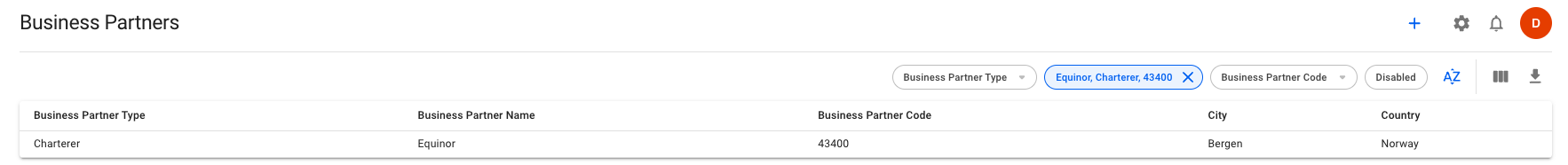 The business partners list displays the following data: