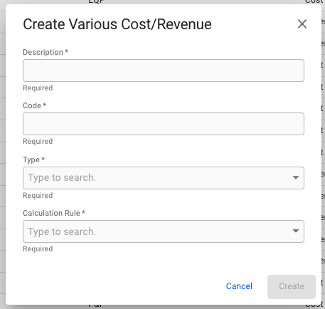 Fill out the fields in the popup: - Description: The name of the various. - Code: A unique identifier of the various. - Type: Labels the various as "cost" or "revenue". - Calculation Rule: Decides how/when the various is calculated.
