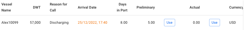 Clicking any of the "Use" button will update the port call's port cost, which will be accumulated on the voyage's overall port costs.