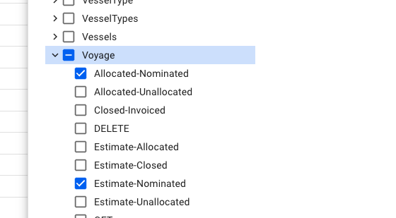 Referring to below screenshot, this security role has only access to two status transitions on Voyage, from Allocated to Nominated and from Estimate to Nominated.