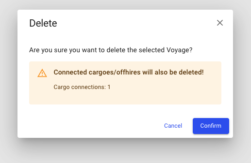 <figure><img src="https://content.gitbook.com/content/bpRXlpuknwnd2ADVp6vn/blobs/0UtEffn08f08Nb459c20/image.png" alt=""><figcaption><p>Alert showing that an offhire and a cargo is connected and will be deleted.</p></figcaption></figure>