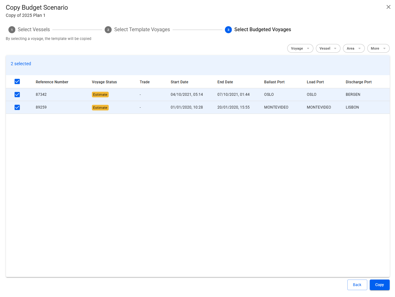 A list of budgeted voyages of the original scenario that you want to copy from will show.