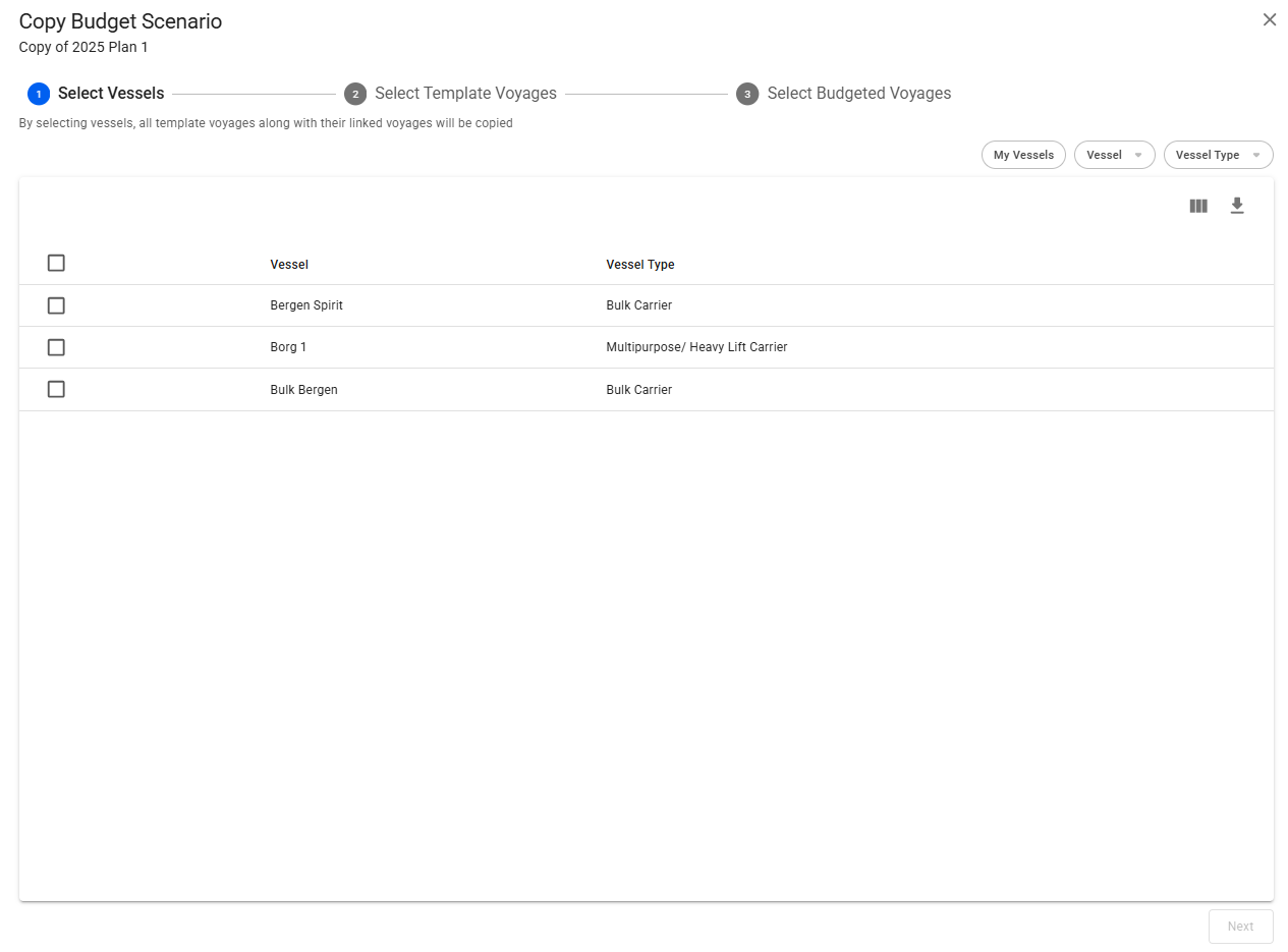 A 3-stepper modal will show up and give you access to define which vessels, template voyages and budgeted voyages from that specific scenario you want to copy over to the new scenario. Firstly, you will be given the option to choose a name for the copied scenario: