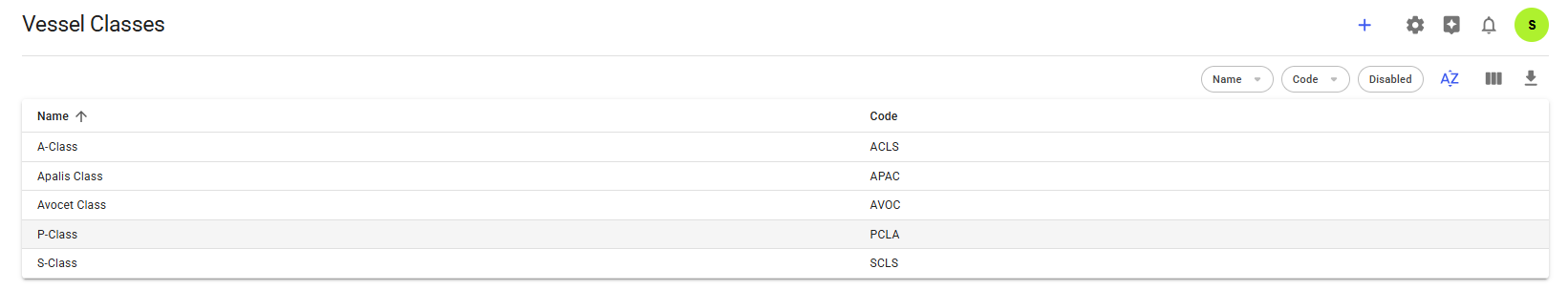 There are three quick filters top right. The first one filters on code, the second on name, and the last one is a 'Disabled' filter, that makes the list display disabled vessel class when enabled.