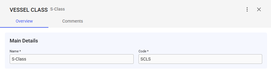 The overview tab contains the main details section where the name and code of the vessel class are editable.
